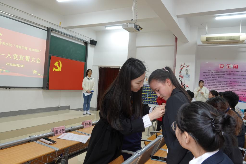 2018级财务管理专业王良红同志作为正式党员代表对加入中国共产党的新同志们表示衷心地祝贺和热烈的欢迎,并对全体预备党员和入党积极分子提出了几点建议:一是要扎实学好党的各项理论、方针、政策和课程基本理论;二是加强自我约束和自觉接受群众监督,及时开展批评与自我批评,找出自身的突出问题并加以改正;三是要从小事做起,从点滴做起,在学习上、工作上做榜样,在生活中做模范。