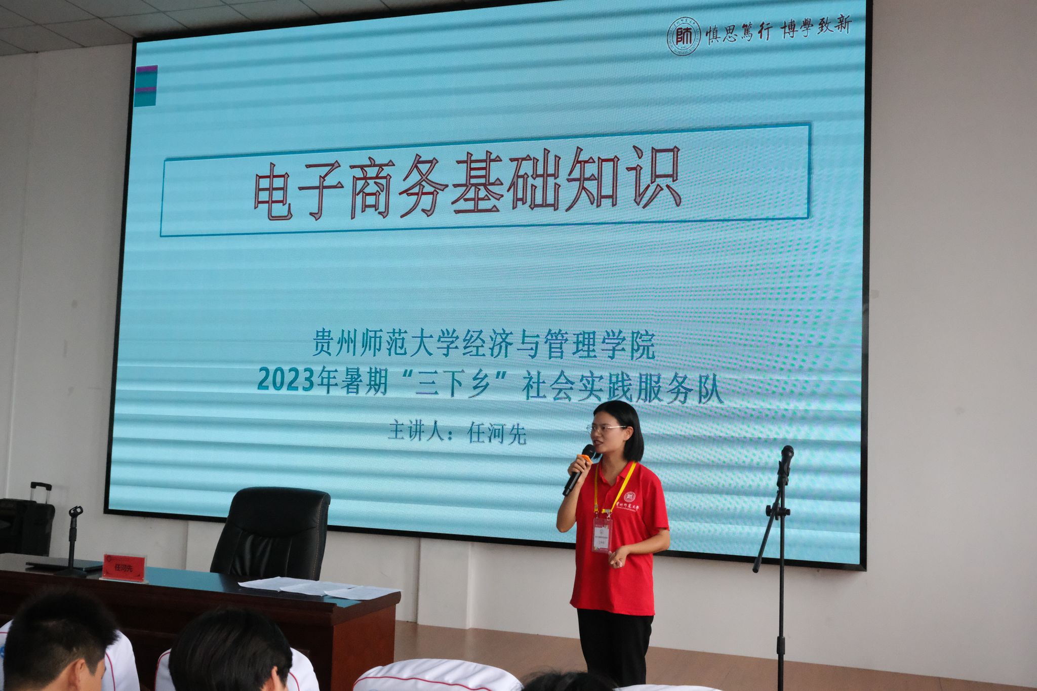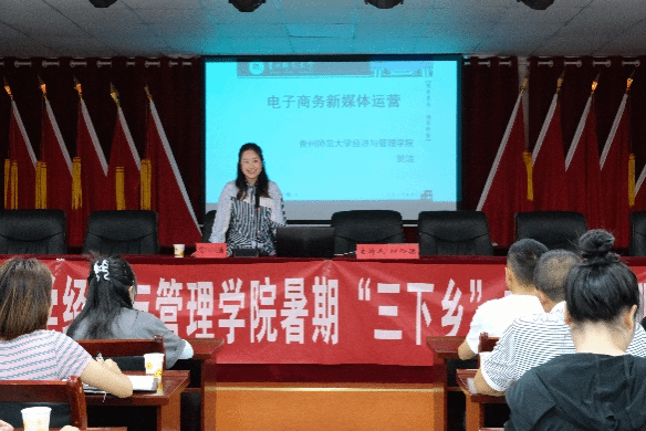 7月11日,电商助农服务队指导教师、第四届全国电商讲师大赛二等奖获得者——贺洁,在站街镇政府会议室为全镇电子商务服务站30余名负责人,开展了农村电子商务业务培训,培训围绕如何运用电商平台为乡村振兴作贡献展开,为各电子商务服务站负责人分享了短视频营销的方式、直播拍摄的筹备及过程等内容,进一步拓宽了电子商务服务站负责人对电子商务知识的认识与技能的提升,激发了乡村振兴的“新动能”。7月13日,电商助农服务队队员、职业技术教育(财经商贸)专业研究生任河先,在贵阳市商贸公司报告厅为贵阳市商贸公司中职一年级50余名员工,作了《电子商务基础知识》的知识普及,她详细地为同学们介绍了近年电子商务的概况和新媒体运营两方面的内容,鼓励现场的同学们要主动学习电商知识,更加系统地了解电商的运营模式,将理论知识转化为学习成效,为服务家乡的经济发展贡献力量。