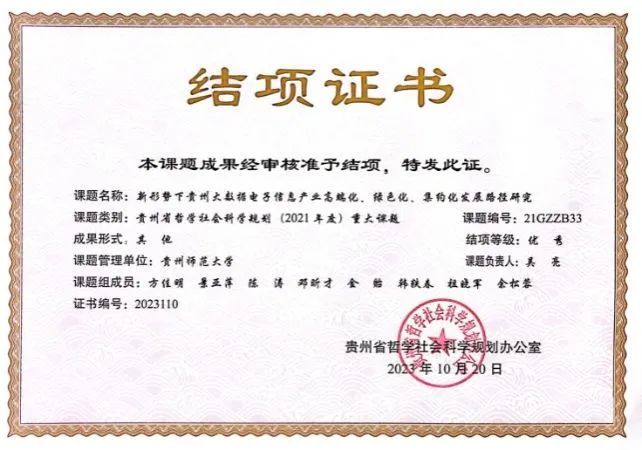 近日,公司吴亮教授主持的贵州省哲学社会科学规划重大课题《新形势下贵州大数据电子信息产业高端化、绿色化、集约化发展路径研究》(课题编号:21GZZB33)结项成果被贵州省哲学社会科学规划办公室鉴定为“优秀”...